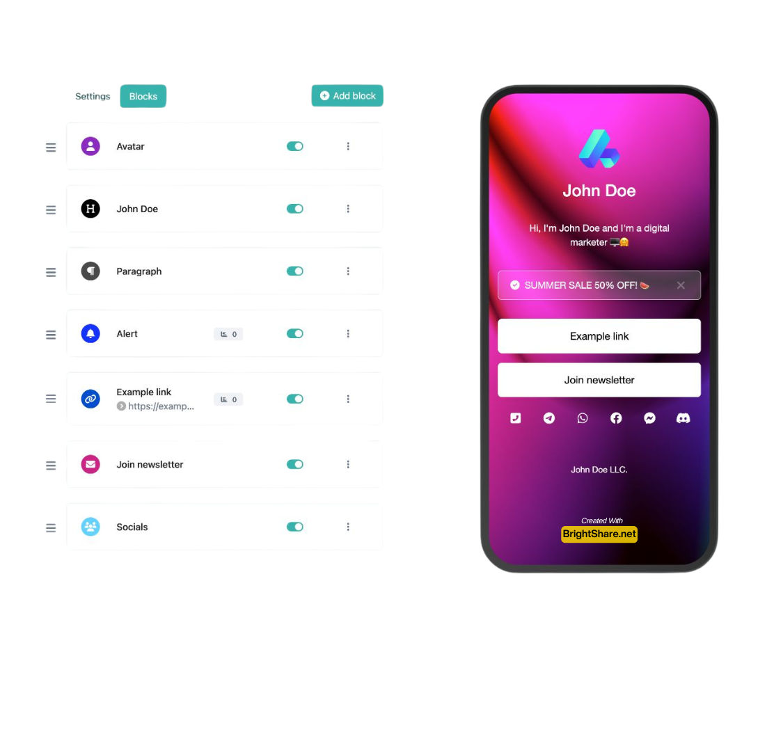 A variety of bright bios, integrations, and design features are available to help you create a Brightshare that effectively showcases your unique brand. Explore our extensive selection of custom templates to effortlessly engage with your audience and boost your online presence!